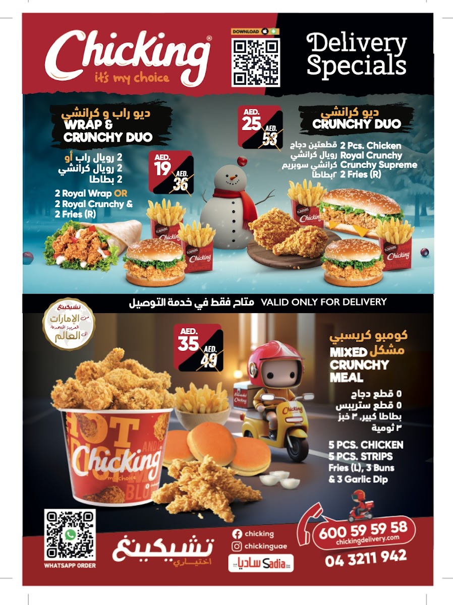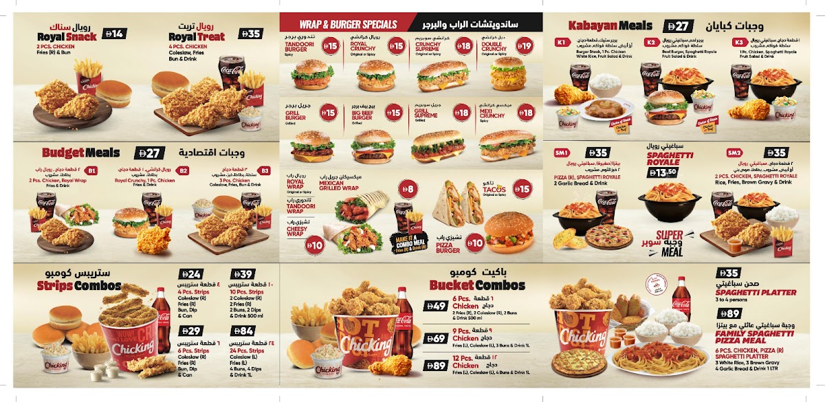 2 pieces of Fried or Grilled Chicken, Royal Crunchy Burger or Royal Wrap served with regular Crispy Fries and Drink.