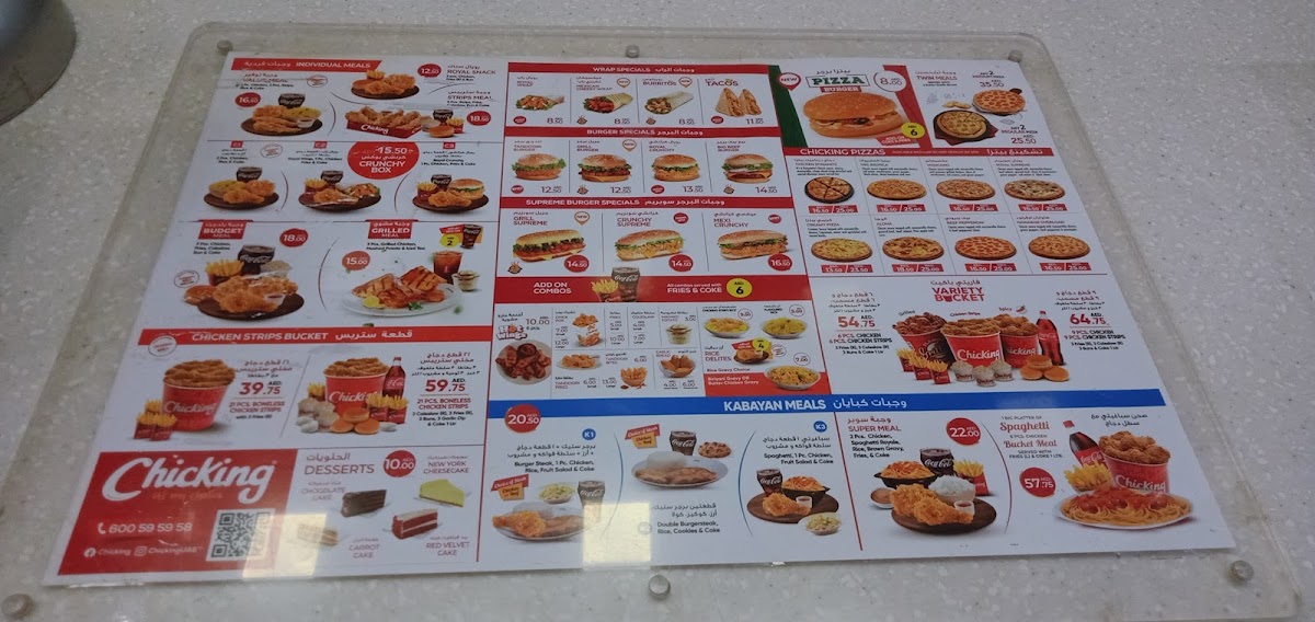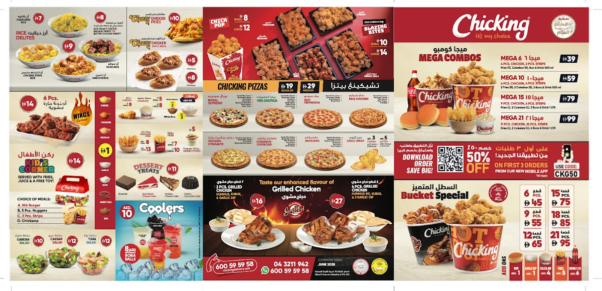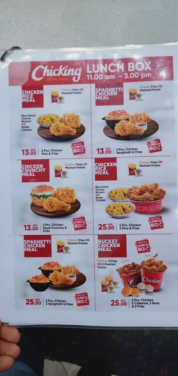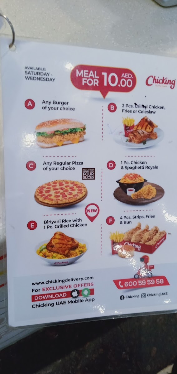 Chicking Century Mall offers a diverse menu that caters to a variety of tastes and cravings. For those looking to feed a group, the Family Feast options are perfect, with choices ranging from the hearty 21 Pcs Family Feast to the more compact 8 Pcs Family Feast. If you're in the mood for something smaller, there are flavorful side items such as Rice Bowl - Biryani Flavor, Cheesy Chicken Fries, and Garlic Paste Grilled Hot Wings (6 Pcs). For pizza lovers, the Pizza Mania section has crowd-pleasers like Beef Pepperoni (M), Hawaiian Overload (R), and Pizza Mexicano (R). The Burger and Wraps menu is also a highlight, featuring the Taco Wrap and the Royal Crunchy Supreme, alongside unique offerings like the Pizza Burger and Mexi-Grill Burger. For a taste of Filipino comfort food, try the Royal Spaghetti or the Spaghetti Chicken Box. Solo diners can opt for the Burger & Wrap Combo or Strips Box, perfect for a quick meal. If you're in the mood for something special, the Pick of the Day offers selections like the 6 Pcs Crunch Treat or the Supreme & Crunchy Duo. Don’t forget to end your meal with a refreshing Fruit Salad. The Fusion Pack choices are great for sharing, with options such as the 11 Pcs Fusion Pack and 24 Pcs Fusion Pack. Overall, the menu at Chicking Century Mall offers a wide variety of delicious options at reasonable prices, making it a great spot for both quick bites and family gatherings.